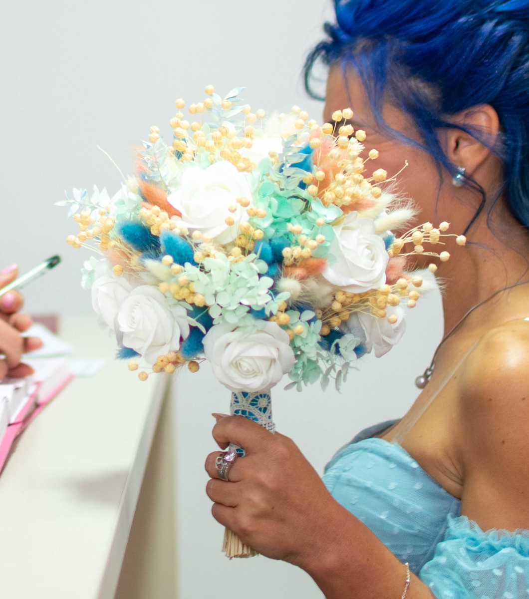 Pastel Romance – This handcrafted bouquet brings together the soft harmony of pastel colors – ivory white, mint blue, peach, and golden yellow – creating a gentle yet striking contrast. Perfect for modern brides with a touch of whimsy and individuality.